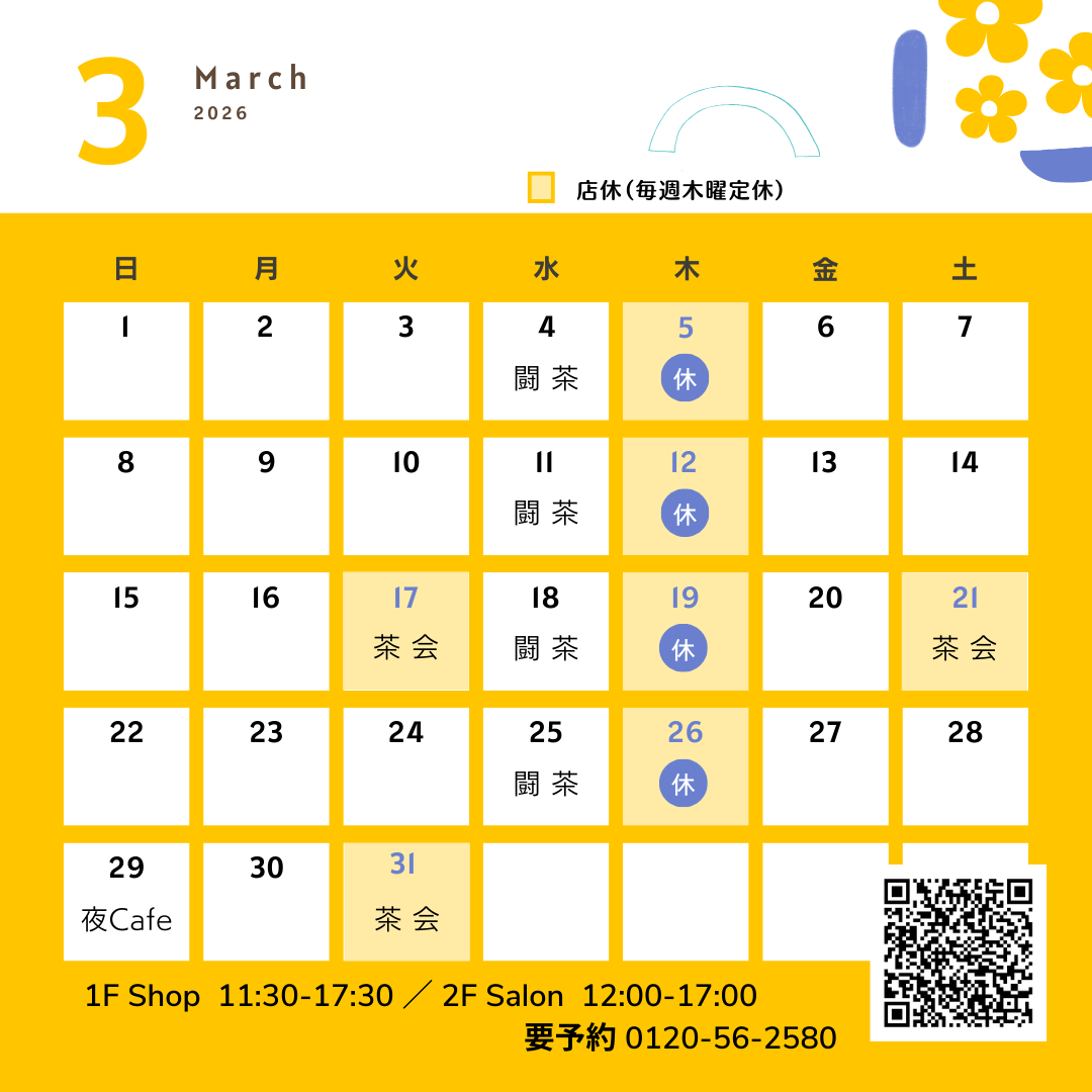 3月の営業時間 11:30-17:30/毎週木曜定休